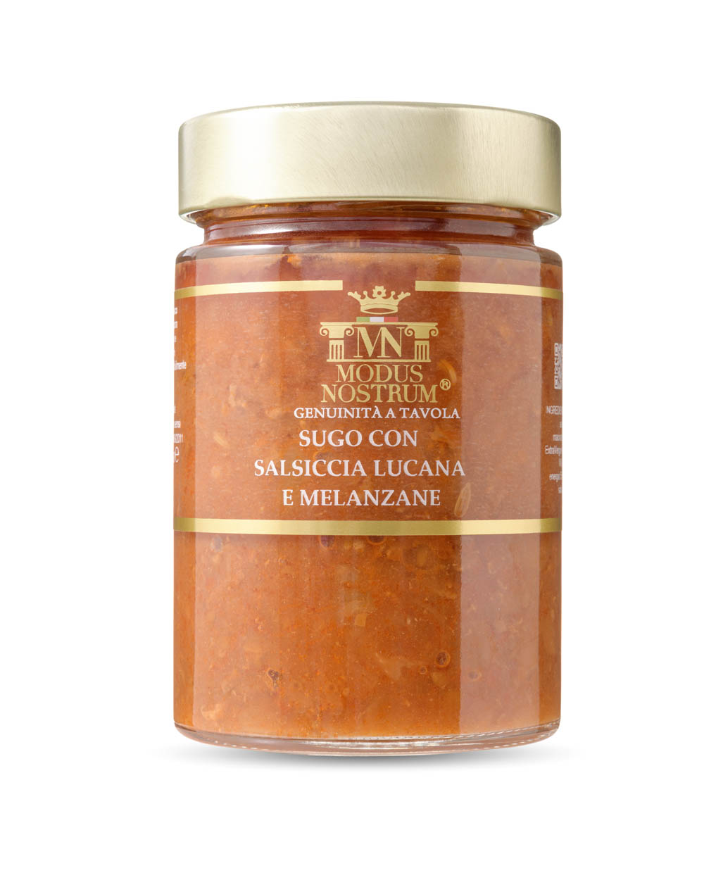 Ingredienti:Pomodoro,salsiccia Lucana 40,6% (carne suina,sale,peperone macinato.finocchietto selvatico)melanzane 17,4%,olio extra vergine di oliva,cipolle,sale,carote,basilico.